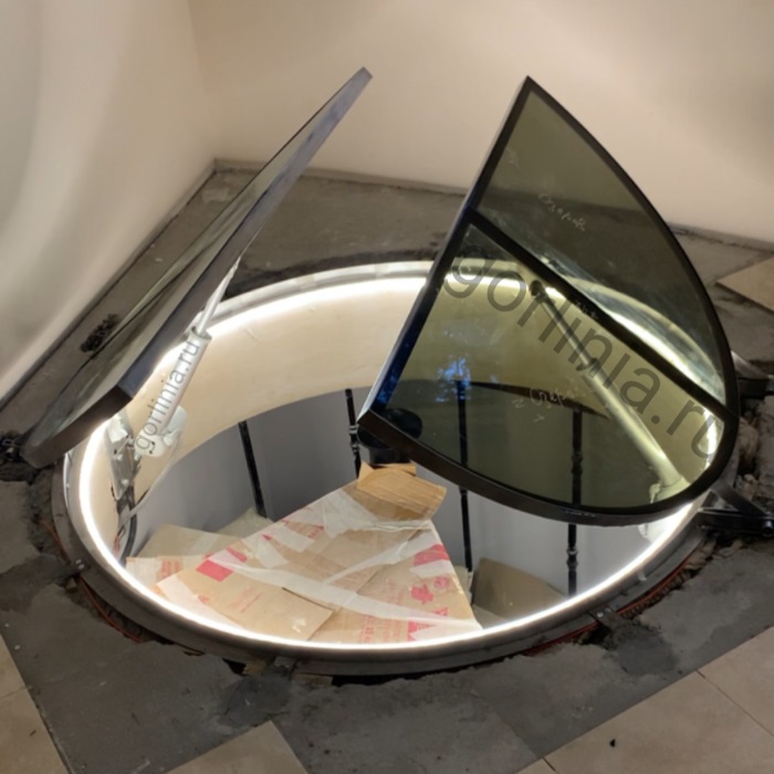 Редукторы подъемника крепятся к вертикальной платформе рамного основания горловины, шток - к импосту стеклопакета. Актуаторы европейской сборки работают синхронно, длина базы и мощность усилия подобраны под массогабаритные характеристики светопрозрачных полукруглых створок.