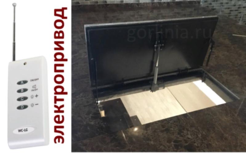 - Крышка с предустановленным линейным приводом подлежит облицовке плиткой, керамгранитом, ламинатом. После финишной отделки установленную конструкцию не видно в плоскости пола.