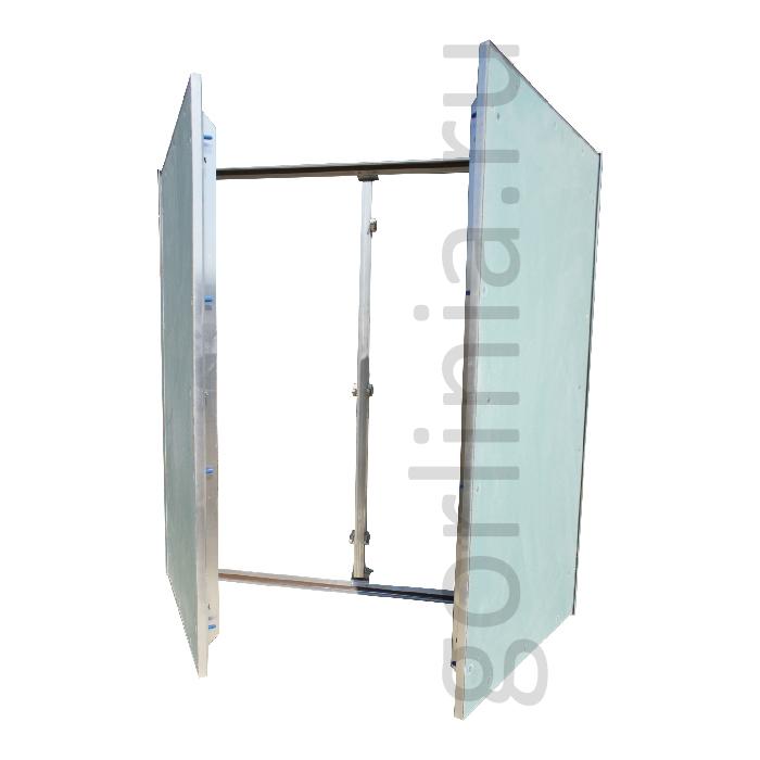 Нажимные створки распахиваются на несъемных петлях с одной осью вращения, дополнительно фиксируется в коробке через съемную перемычку по центру