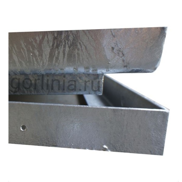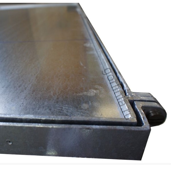 Рама сварена из сортового уголка 50х5. Каркас двери с внешним кантом выполнен с обвязкой из профиля 50х25 с ячейкой в осях 300х300. Дно крышки закрыто оцинкованным листом 2 мм клепочным соединением с расчетной глубиной 20 или 30 мм в зависимости от толщины декинга.