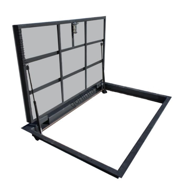 Конструкция смещенного за ось узла шарнира позволяет плиточникам убрать щель над петлей, сохранив при этом важный размер лаза в чистоте 1050х600 для комфортного спуска в подвал.