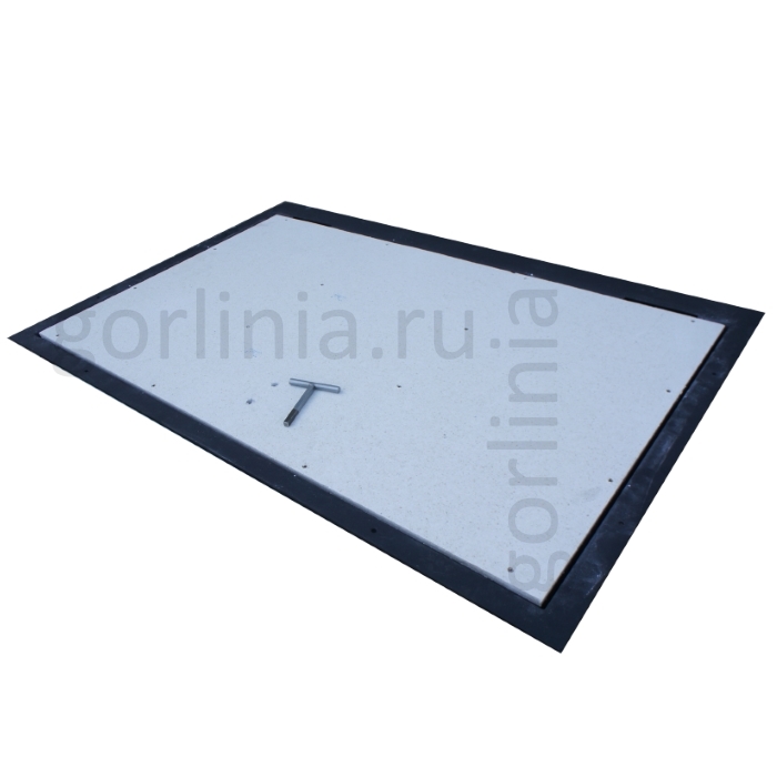 Каркас полотна сварен из трубы 30х20 в комбинированных положениях с заполнением ГВЛ в уровень коробки под облицовку плиткой по принципу невидимки с сохранением рисунка и швов раскладки керамогранита в комнате. Для открывания лаза в погреб 1150х700 используется съемная ручка.