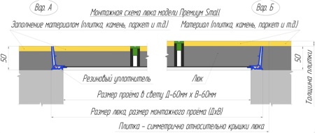 Обращаем Ваше внимание, что залитая бетонной смесью вынимаемая крышка люка 60х60 см. будет весить около 30 кг. с наклеенной плиткой. Для уменьшения массы съемной крышки используйте пенобетон или ячеистый материал в качестве стяжки.