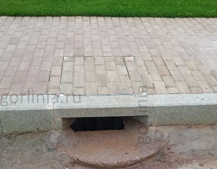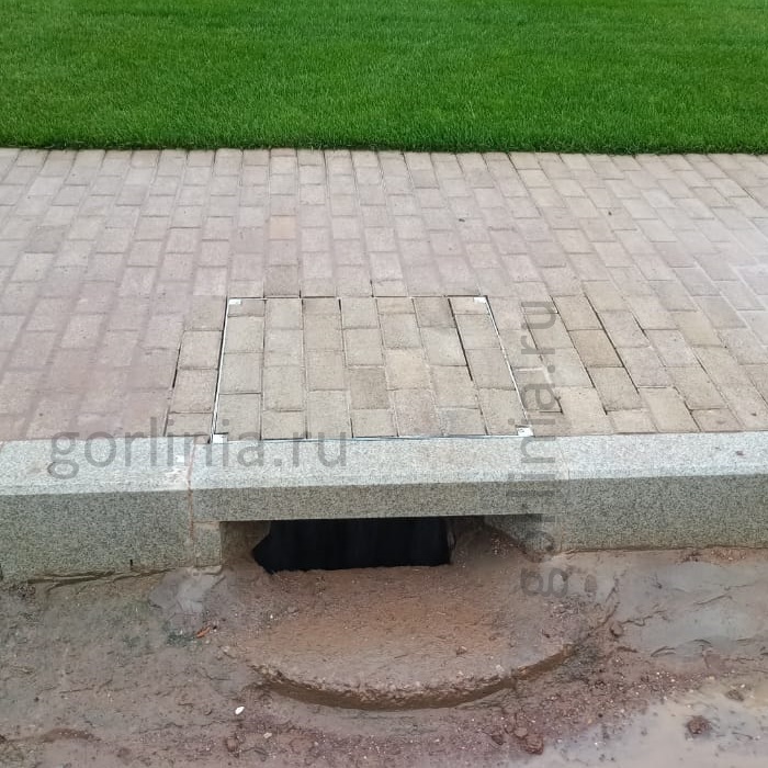 Круглые чугунные люки 50 шт. заменили на скрытые тротуарные под мощение брусчаткой в раскладку плитки - теперь ливневые колодцы не выделяются на дорожке!