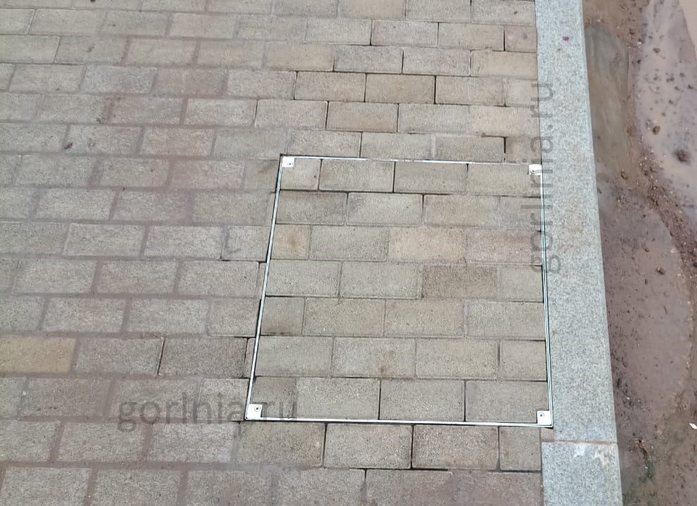 Предложены вынимаемые крышки чистовым размером 600*600 под брусчатку h=80 с холодным цинкованием корпуса. Квадратная форма заполняемого корыта вписалась в линии мощения тротуаров без лишней резки кирпича. Фланцы запорно-замкового устройства сделали минимального размера, потому что заказчику было важно сохранить рисунок декоративного мощения без лишних элементов и выступов на дорожном полотне.
